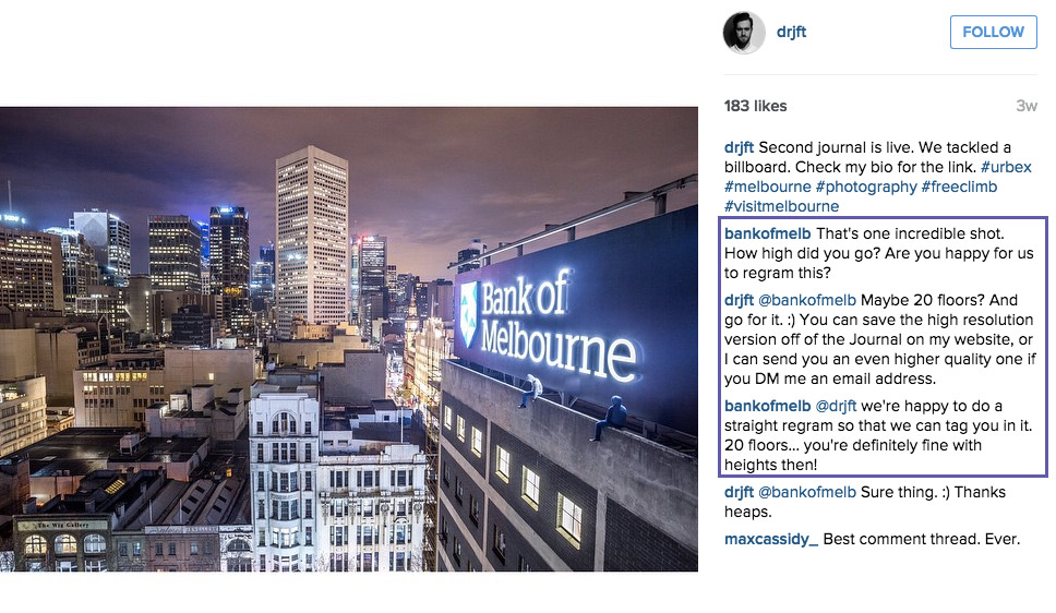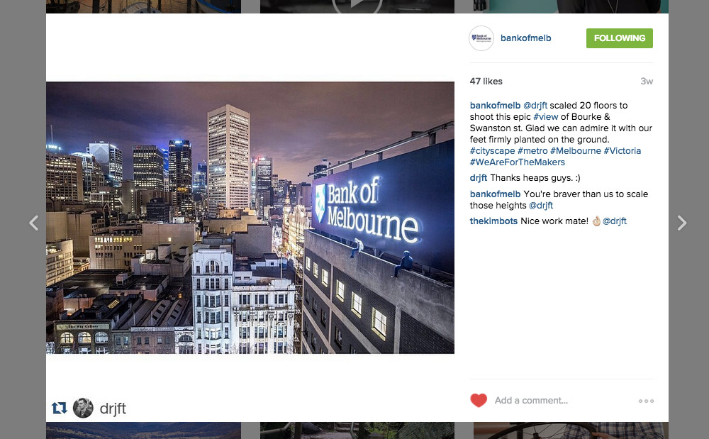 Let me get this out of the way. I’m not accusing Bank of Melbourne of any wrongdoing, but it’s more of a strange story on the content marketing landscape. In no way have Bank of Melbourne actively supported robbery (obviously), but inadvertently, they have supported a thief and trespasser. Equally, I advised Bank of Melbourne of this post prior to publication (I didn’t want to create a a real headache for someone), and they have since taken the posts down. Also, mentioned Instagrammer @drjft has also gone ‘private’, so the topic of which I’m talking is of real relevance.