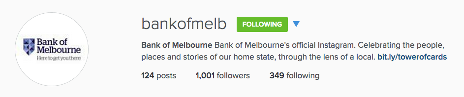 If I get followed by some known brand – and I’ll use @bankofmelb for this – I’m generally curious on 2 fronts. 1) What type of content are they posting, and 2) What is their agenda (cause, it will have an internal ROI)?. So on @bankofmelb, what do they stand for?